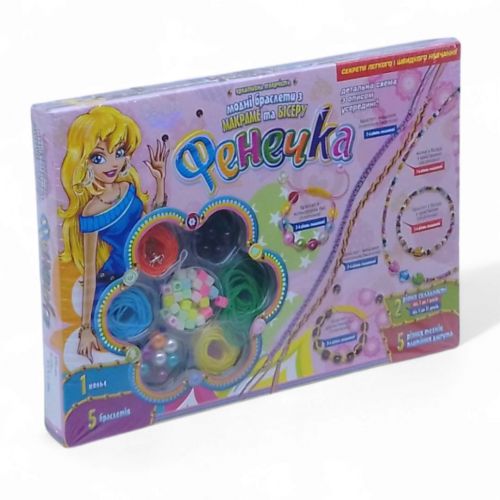 Набір для творчості “Фенічка”. Виготовлення 1 кольє і 5 браслетів з бісеру і макраме різної складності. Комплектація: різнобарвна нитка “джгут”, еластична нитка, різнокольорові намистини, полімерні кристали, різнокольоровий бісер, металевий замок – карабін, деревяні намиста, детальна покрокова інструкція.