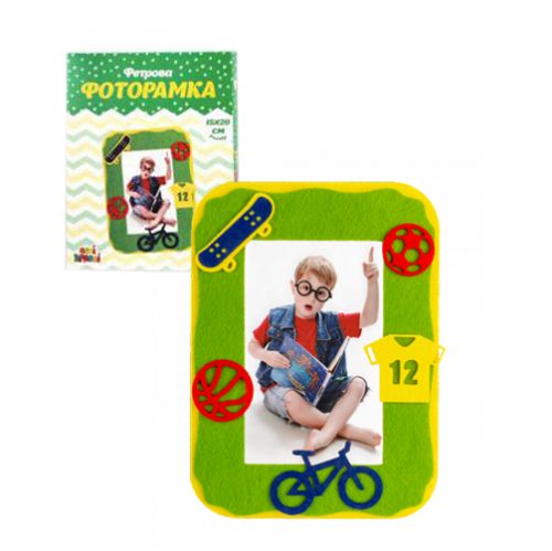 Набір для творчості “Фоторамка”. Можна створити і декорувати красиву, яскраву фоторамку з фетру. У наборі є: фетрові викрійки, підставка для рамки, клей. Розмір готового виробу – 15х20 см.