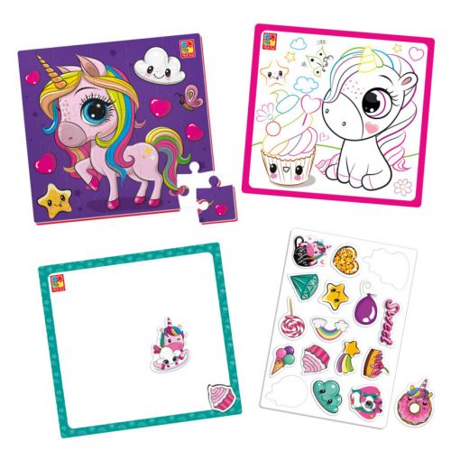 Набір для творчості оригінальний подарунок для дитини на день народження або будь-яке свято. Починаючи з малих наборів дитина познайомиться з різними видами творчості та розвине відчуття смаку. Комплектація: пазл на 25 елементів, розмальовка, 16 наліпок, поле для декорування. Виконаний набір з якісних та безпечних матеріалів