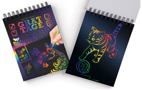 Набір для творчості “GRATTAGE” А6. Гратаж – це спосіб виконання картини, методом процарапуванії зображення на картоні гострим інструментом. Знімаючи штихелем шар захисної фарби проявляється яскравий і оригінальний малюнок. Блокнот містить три заготовки з контурами і три заготовки для індивідуальних і творчих відкриттів.