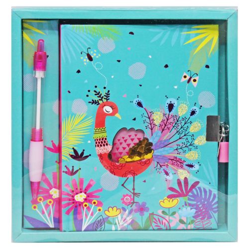 Симпатичний подарунковий набір з яскравим блокнотом на замочці та ручкою. На обкладинці блокнота є прозоре віконце, через яке видно кишеньку з золотистими блискітками. Закривається на замочок, у комплекті є два ключики. 56 аркушів у лінію. Розмір блокноту 19х10 см.