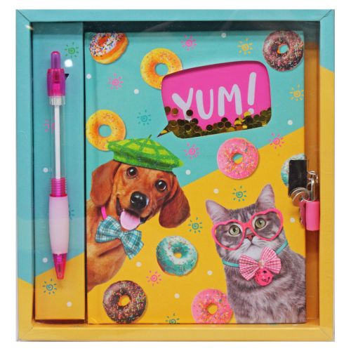 Симпатичний подарунковий набір з яскравим блокнотом на замочці та ручкою. На обкладинці блокнота є прозоре віконце, через яке видно кишеньку з золотистими блискітками. Закривається на замочок, у комплекті є два ключики. 56 аркушів у лінію. Розмір блокноту 19х10 см.