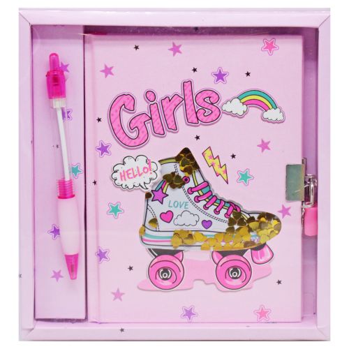 Симпатичний подарунковий набір з яскравим блокнотом на замочці та ручкою. На обкладинці блокнота є прозоре віконце, через яке видно кишеньку з золотистими блискітками. Закривається на замочок, у комплекті є два ключики. 56 аркушів у лінію. Розмір блокноту 19х10 см.