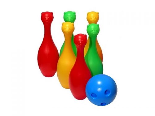 Набір “Кеглі ведмедики”. Кеглі (6 штук) різного кольору + 1 кулю для боулінгу з отворами під пальці. Розмір кеглі – 8 х 8 х 26 см. Діаметр м’ячика – 10 см.