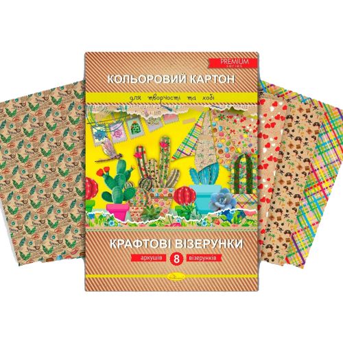 Набір кольорового картону з візерунками, 8 аркушів формату А4. Кожен лист має унікальний візерунок. Використовується для творчих робіт у школі та вдома. Запакований у зручну папку з яскравим малюнком. Різні види асортиментів.