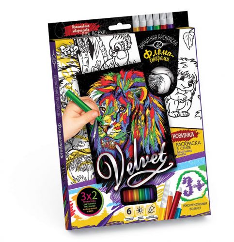 Набір креативної творчості “Оксамитова розфарбування фломастерами VELVET”. Поєднання об’ємного чорного оксамиту і яскравих кольорів фломастерів, створює неповторний ефект і розвиває художній смак. Три малюнка різного розміру (14,8 х 21 см, 20,5 х 26 см і 14,8 х 21 см). 6 фломастерів.