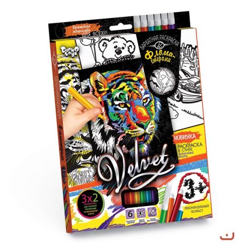 Набір креативної творчості “Оксамитова розфарбування фломастерами VELVET”. Поєднання об’ємного чорного оксамиту і яскравих кольорів фломастерів, створює неповторний ефект і розвиває художній смак. Три малюнка різного розміру (14,8 х 21 см, 20,5 х 26 см і 14,8 х 21 см). 6 фломастерів.