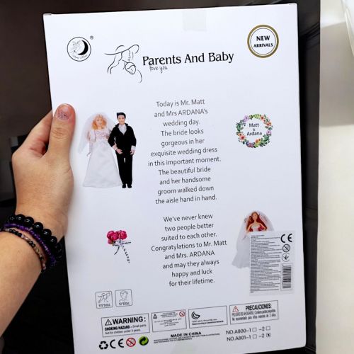 Ігровий набір з двома ляльками (він і вона). Одягнені в весільне вбрання. Висота ляльок, приблизно 30 см. Виготовлені ляльки з якісних та безпечних матеріалів (тулуб і кінцівки – пластик, голови – гума). У обох ляльок руки з шарнірами. Ігри з ляльками чудово розвиватимуть у дітей сюжетне та образне мислення, уяву, соціальні навички та вміння гратися. Укомплектовано все в картонну коробочку зі слюдою. Рекомендовано для дітей старше 3-х років.