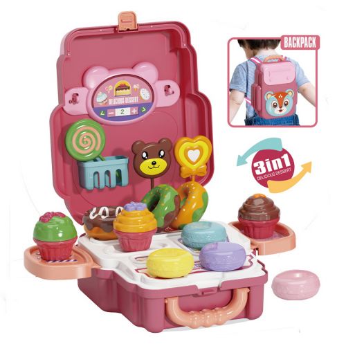 Ігровий набір, який обов’язково зацікавить будь-яку дитину. У наборі є іграшкові десерти (21 елемент) такі, як: пончики, льодяники, пирожки, кекси. За допомогою спеціальних елементів, які є в наборі, рюкзак можна перетворити на стійку з десертами. У наборі є тканинні шлейки для рюкзака. Набір призначений для дітей віком від 3-х років.