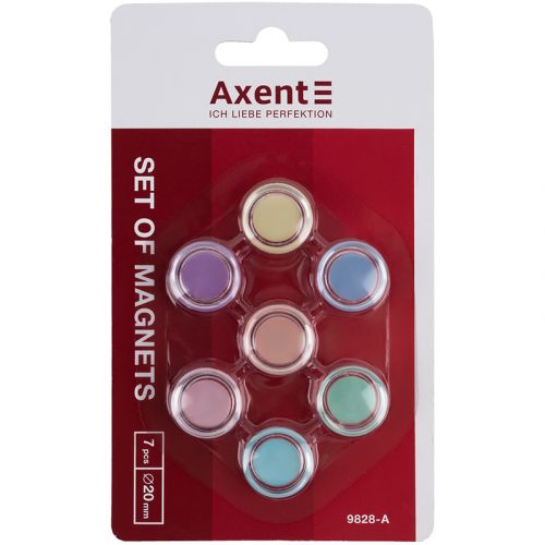 У наборі — 7 різнобарвних круглих магнітів у пластиковому корпусі, упаковані в прозорий блістер. Діаметр кожного магніту — 20 мм ширина, 7мм висота.