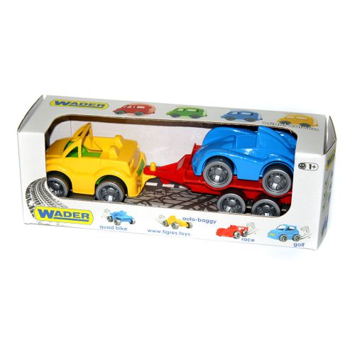 Набір складається з машинки кабріолета, до якої кріпиться причіп на колесах, за допомогою якого кабріолет може перевозити гоночну машинку. Розмір однієї машинки: 9 см. Машинки дуже яскраві, виготовлені з якісного пластику.