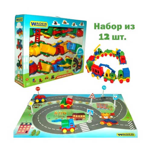 Набір складається з 12-ти яскравих пластикових машинок: вантажівок, екскаваторів, легковий і гоночної машини, бетономішалки та поїзди з причепом. Також в наборі є велика карта (79 х 59 см) з намальованою на ній дорогий. Сама коробка містить 6 дорожніх знаків і світлофор, які потрібно видавити з картону і встановити на дорозі за допомогою підставки-основи. Розмір однієї машинки: 9 см.