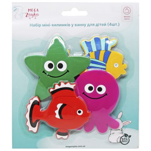 Набір із 4-х яскравих резинових наліпок на присосках, які можна прикріпити на кахель, дно або стінки ванни, щоб запобігти ковзанню. Виконані у вигляді морських мешканців, яскравий та приємний оку дизайн обовʼязково приверне увагу дитини та зробить процес купання цікавішим. Розмір одного килимка: 10х9 см.