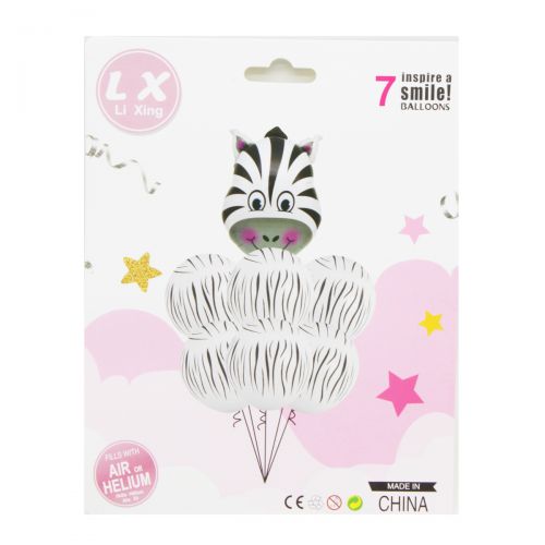 У набір кульок “Зебра” входить одна велика фольгована куля у вигляді голови зебри і 6 маленьких кульок з візерунком, що повторює смужки на тілі тварини. Розмір фольгованої кулі – 63х40 см. У наборі є моток стрічки для зав’язування куль.