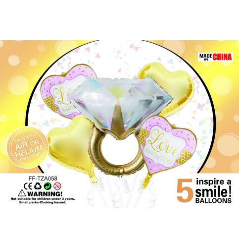 Яскравий набір кульок “Кільце”. Милий та барвистий комплект. У наборі 5 фольгованих кульок: 1 велика кулька у вигляді кільця, 4 у вигляді сердечок. Всі кульки якісні та надійні.