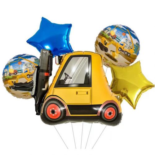 Яскравий набір кульок “Навантажувач”. Милий та барвистий комплект. У наборі 5 фольгованих кульок: 1 велика кулька у вигляді навантажувача, 2 у вигляді зірок та 2 з малюнками. Всі кульки якісні та надійні.