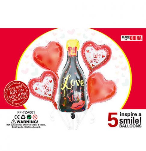 Яскравий набір кульок “Шампанське”. Милий та барвистий комплект. У наборі 5 фольгованих кульок: 1 велика кулька у вигляді пляшки шампанського, 2 у вигляді сердечок. Всі кульки якісні та надійні.