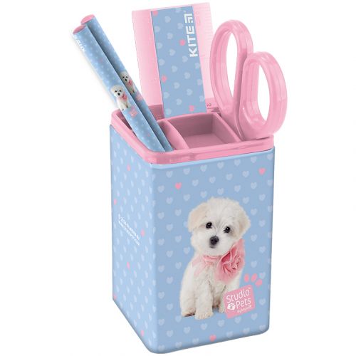 Набір канцелярський Kite складається з: 1. Двох графітних олівців середньої твердості. Товстий і м’який грифель малює плавно, не кришиться і не дряпає папір. Довжина виробу 175 мм, товщина грифеля – 3 мм. При заточуванні або падінні олівець не ламається. Олівець покритий кольоровим малюнком – покриття запобігає розсиханню і появі тріщин на корпусі. 2. Лінійки, виконаної з прозорого пластика, має широкі роздільники. Лінійка термостійка, стійка до механічних пошкоджень і подряпин. Довжина виробу 15 см. 3. Металеві ножиці із закругленими кінцями, які також можна носити в шкільному пеналі. 4. Міцногометалевого стаканчика, призначеного для зберігання шкільного приладдя та грамотної організації робочого місця. Стакан-підставка розділений на відсіки, що дозволяє швидко знайти потрібну канцелярію.