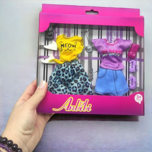 Набір із 2-х яскравих нарядів для лялечок стандартного розміру (заввишки 28 см). Наряди виконані з якісних матеріалів, мають міцні та надійні шви. Також в набір входить 2 пари туфель, 2 модні клатчі та ремінь. Набір обовʼязково сподобається маленьким модницям. Для дітей віком від 3-х років.