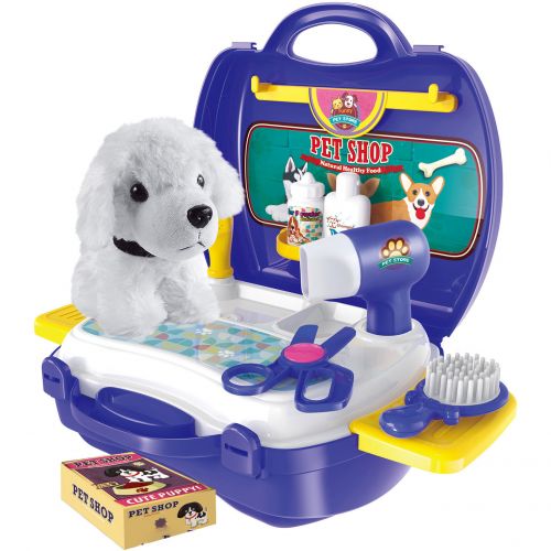Комплектація: Валіза, столик з поличками, м’яка іграшка собачка, гребінець, ножиці, фен, душ, 2 баночки, коробочка, наклейки