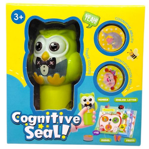 Набір печаток виконаний у привабливому дитячому дизайні з яскравими кольорами. Основний елемент – фігурка у вигляді сови, що використовується як тримач для штампів. У комплекті передбачені змінні штампики з різними зображеннями для створення відбитків на папері.