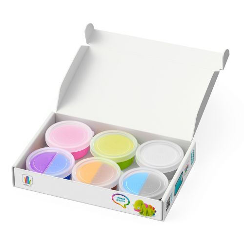 - В набір може входити до 10 різних кольорів (баночка може містити пластилін двох різних кольорів).