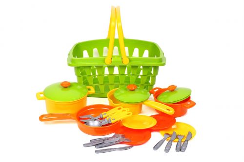 Яскравий пластиковий набір складається з кошика з ручками, 2х каструльок кришечками, каструльки з ручкою і кришкою, сковорідки, 4х тарілок, 4х вилок і ножів, 4х приладів для готування.