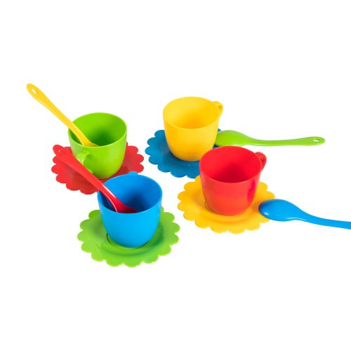 Набір яскравою пластикової посудкі з 12 предметів. В комплекті: 4 чашки, 4 блюдця і 4 чайні ложечки.