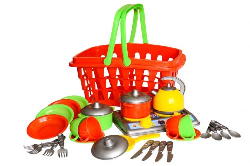 Набір яскравою пластикової посудкі. У комплекті: плита на 2 конфорки (22 х 16 см), 8 тарілочок, 4 чашечки, сковорідка з кришкою, каструлька з кришкою, чайник з кришечкою, 4 ложечки, 4 вилочки і 4 ножа. Для упаковки – пластикова кошик з зручними ручками.