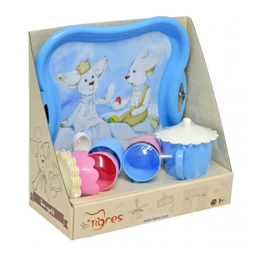 Гарний пластиковий дизайнерський набір для чаювання, ніжного блакитного кольору. У наборі: піднос з термонаклейка, чайничок з кришечкою, 4 чашечки, 4 блюдця, цукорниця і 4 чайні ложечки.