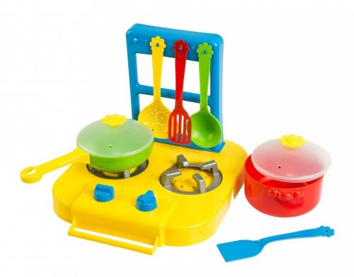 Набір яскравою пластикового посуду “Ромашка” складається з плити з 2-ма конфорками і підставкою для лопаток, каструльки з кришечкою, каструльки з ручкою і кришкою, і 4х приладів для готування.