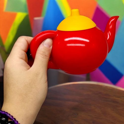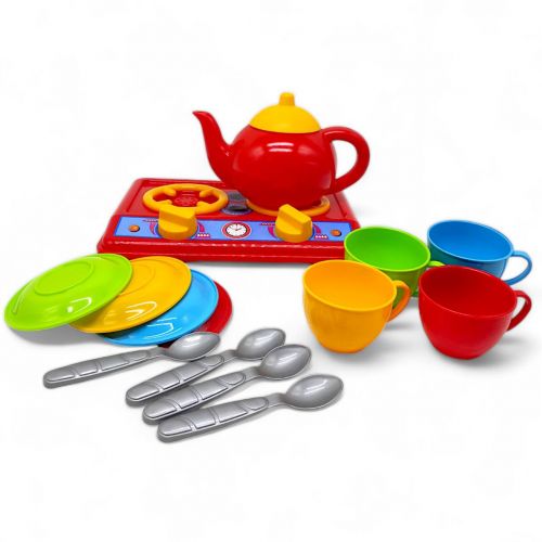 Набір яскравою пластикової посудкі. У комплекті: плита з 2-ма конфорками (22 х 16 см), чайничок, 4 чашечки, 4 блюдця і 4 чайні ложечки.