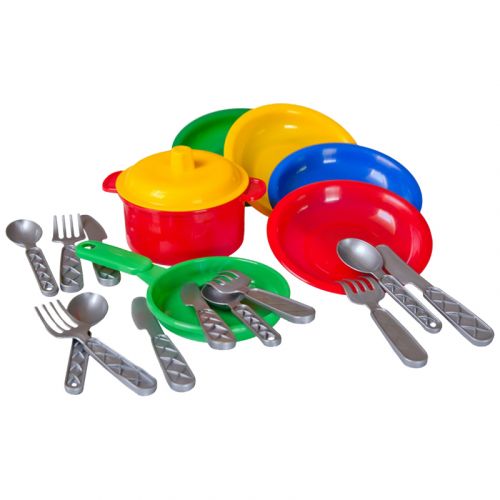 Набір яскравою пластикової посудкі. В комплекті: 4 тарілочки, сковорідка, каструлька з кришкою, 4 ложечки, 4 вилочки і 4 ножа.