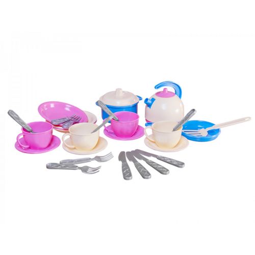 Комплектація: 4 тарілочки, 4 блюдця, 4 вилки, 4 ложки, 4 ножа, 4 чашечки, сковорідка, каструлька з кришкою, чайничок з кришечкою, шумівка
