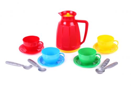 Набір яскравою пластикової посудкі. В комплекті: 4 блюдця, 4 чашечки, 4 ложечки і графин з кришечкою.