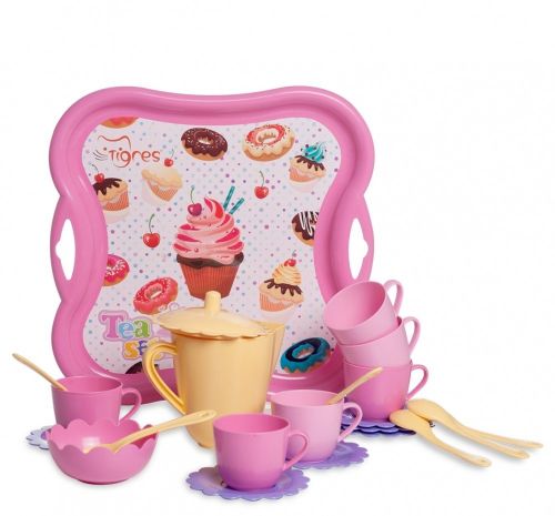 Гарний пластиковий дизайнерський набір для чаювання, ніжних квітів. У наборі: піднос з термонаклейка, чашечки (6 шт.), Блюдця (6 шт.), Чайні ложечки (6 шт.), Цукорниця з кришечкою, графин. Розміри: піднос – 29 х 29 см, чашка – 5 х 7 см, блюдце – 10 х 10 см, графин – 10 х 9 см.