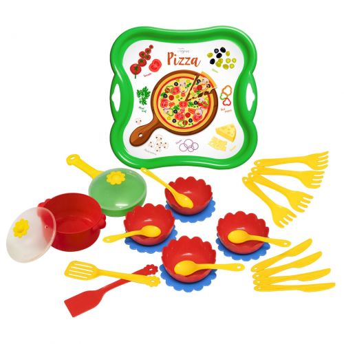 Набір пластикового дитячого посуду на підносі з яскравим, “апетитним” принтом. У комплекті: піднос (29 х 29 см), 4 мисочки (d=9 см), 4 тарілочки (d=12 см), 4 ложки, 4 вилки, 4 ножі, 2 лопатки, кастрюля та сковорідка з кришечкою. Призначений для дітей віком від 12 місяців.