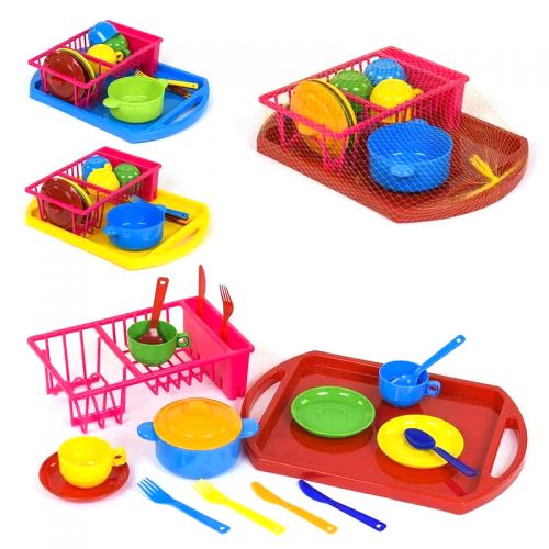 Пластиковий набір посуду “Юна господиня” з 19 елеметов. У комплекті: піднос, підставка під посуд, каструлька з кришкою, чашки, блюдця, столові прилади (ножі, ложки, вилки).