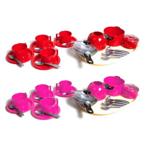 Набір яскравою пластикової посудкі. У комплекті: піднос (31,5 х 21 см), каструлька з кришкою, цукорниця з кришкою, сковорідка, 4 тарілки, чайник, 4 чашки, 4 вилки і 4 ложки.