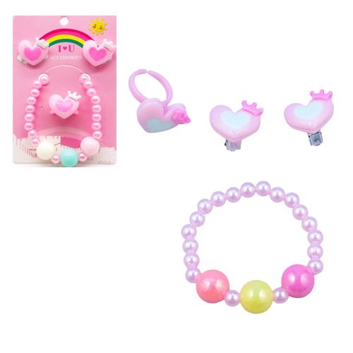 Набір яскравих оригінальних прикрас з блискучими сердечками. У комплекті: пара сережок-кліпсів, браслетик з намистин і красиве колечко. Набір відмінно підійде для маленьких модниць і зробить їх образ незабутнім.