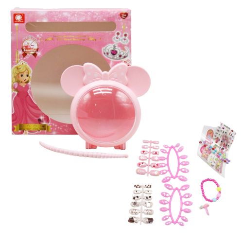 Великий набір прикрас буде чудовим подарунком маленьким модницям. У комплекті є 4 набори пластикових накладних нігтів та клейка база для них, наклейки на нігті, стрази, пилка, роздільник пальців для педикюру. Також у наборі є 2 аркуші з тимчасовими татуюваннями у вигляді наручного годинника, а також біжутерія: браслетик та пластикова каблучка. Усі складові набору можна скласти в гарну пластикову коробочку у вигляді мишки Мінні Маус. Її також можна перетворити на сумочку, прикріпивши ручку. Розмір коробочки: 17х17х7 см.