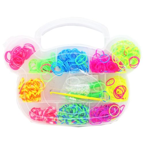 Набір яскравих різнокольорових резинок в оригінальній прозорій коробочці у вигляді ведмедика. У комплекті: сполучні гачки, гачок для плетіння, рогатка та різнокольорові резиночки, за допомогою яких можна створювати різні прикраси на свій смак. Плетіння резинками розвиває творчі здібності, дрібну моторику рук та посидючість.