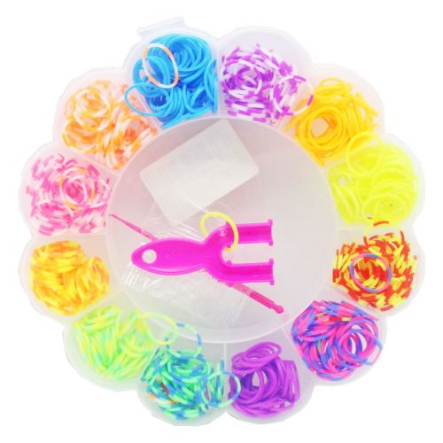 Набір яскравих різнокольорових резинок в оригінальній прозорій коробочці у вигляді квіточки. У комплекті: сполучні гачки, гачок для плетіння, рогатка та різнокольорові резиночки, за допомогою яких можна створювати різні прикраси на свій смак. Плетіння резинками розвиває творчі здібності, дрібну моторику рук та посидючість.