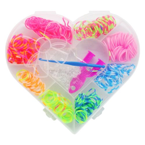 Набір яскравих різнокольорових резинок в оригінальній прозорій коробочці у вигляді квіточки. У комплекті: сполучні гачки, гачок для плетіння, рогатка та різнокольорові резиночки, за допомогою яких можна створювати різні прикраси на свій смак. Плетіння резинками розвиває творчі здібності, дрібну моторику рук та посидючість.