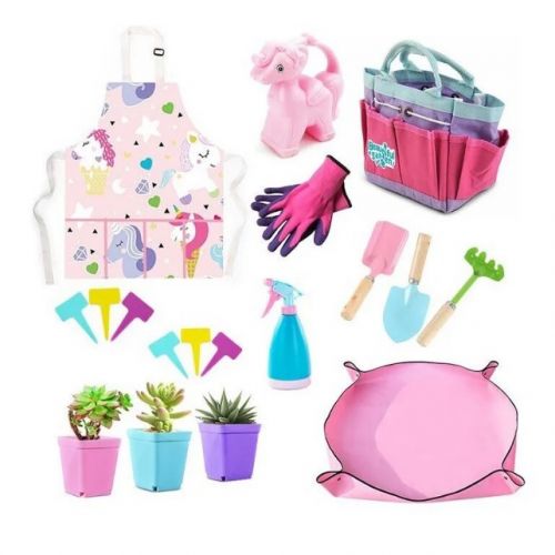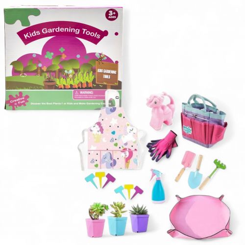 Дитячий набір для садівництва – чудовий подарунок для маленьких дослідників природи! В комплекті три міцні металеві інструменти з дерев’яними ручками, підстилка для пересадки 40×40 см, лійка обʼємом 500 мл, розпилювач, рукавички, фартух, пластикові горщики, маркери та зручна сумка. Все продумано до дрібниць і безпечно. Допомагає розвивати дрібну моторику, відповідальність та любов до природи.