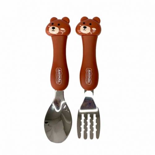 Набір дитячих столових приборів. Металеві. Ручки досить великі та виконані у формі кумедних персонажів. Довжина 1 прибору – 14,5 см. Упаковано все в пластиковий футляр.