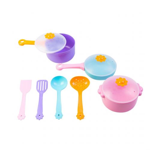 Яскравий набір пластикового посуду. Вона складається з: сковорідок з кришечками 2 видів, каструлі з кришечкою, двох лопаток, шумівки і ополоника. Ручка з пательні знімається, перетворюючи її в зручне блюдо для випічки. Діаметр каструльки: 12 см.