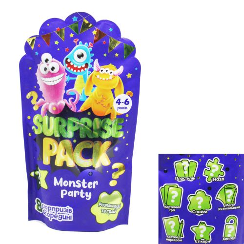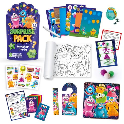 Набір сюрпризів Monster party. Гра розпакуй та грай. Усередині 8 сюрпризів, серед них: пластилін, пазли, гра, слайм, мега розмальовка, картки з маркером, стікери, хенгер. Набір призначений для дітей віком від 4-6 років.