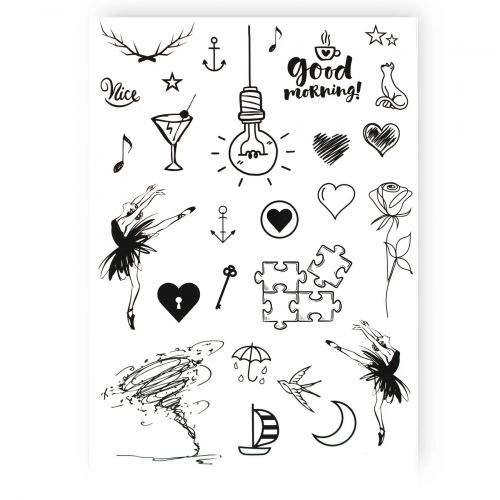 Набір татуювань-перебивок “Tattooshka”. В упаковці мінімалістичні татуювання. Вирізати необхідне тату, наклеїти на руку або іншу частину тіла, змочити теплою водою, відклеїти. Розмір листа з татуюванням: 14,5х21см.