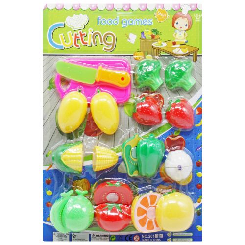 Комплектація: овочі та фрукти (апельсин, помідор, часник, солодкий перець, кукурудза, полуниця, броколі, лимон, диня) досточка для нарізування та ніж.